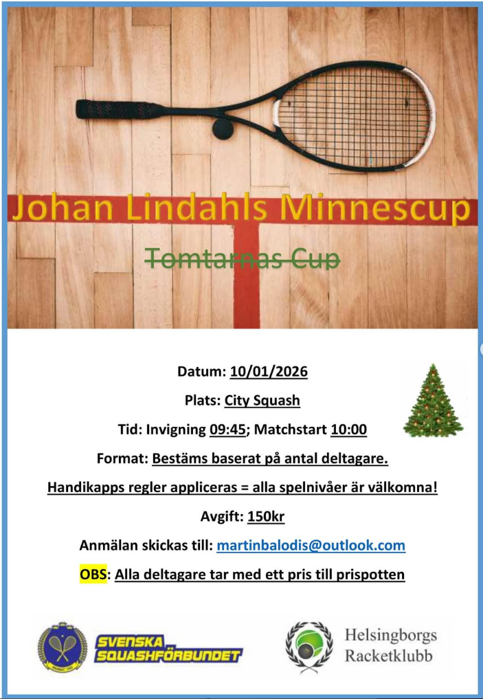 Tävlingsledningen och klubben vill passa på att hedra Johan Lindahl som gick bort tidigare i år. En god kamrat som brann för många saker. Inte minst Squash. Han grundade denna tävling med dess speciella upplägg för många år sedan, och det är därför naturligt att tävlingen from nu bär hans namn. Vila i frid Johan!